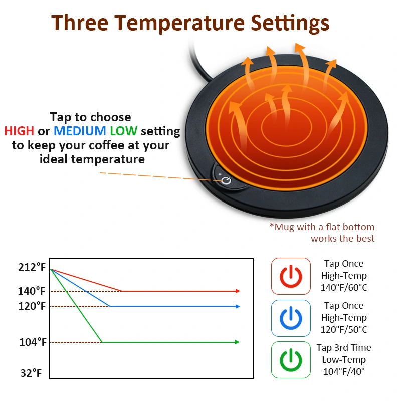 | 3 Temperature Settings (40/50/60°C) | Users can choose the ideal warmth for any beverage: 40°C for gentle warming, 50°C for optimal drinking, 60°C for keeping coffee/tea hot. |