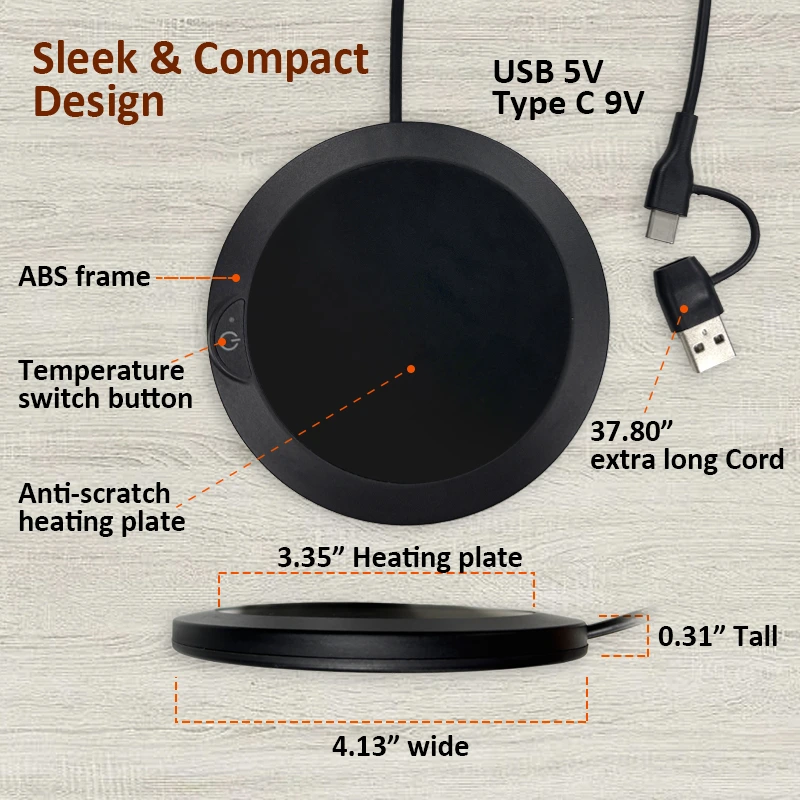 The warmer features three selectable temperature settings (40°C / 50°C / 60°C) , allowing users to customize their drinking experience – from gently warming a delicate tea to keeping coffee piping hot. Powered by a standard 5V USB port (computer, power bank, or wall adapter), it consumes minimal energy while providing consistent warmth.